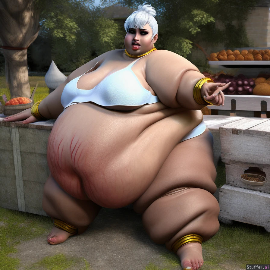 best quality, high rating, (masterpiece), (HD 4k resolution), (highly detailed), (3D render), perfect anatomy, (side angle), realistic proportions, solo, full body, ((Obese elena(street fighter))), huge round unflattering belly, about to pop, bloated, sagging belly, big lovehandles, (detailed fat face, double chin, detailed large eyes with pupils), flabby arms, narrow_hips, stretchmarks on her skin, plump_lips, brown_skin, white_hair, (pixiecut short hair), (wearing white cloth bikini), (moobs), sagging bellybutton, gold bracelets, gold choker, African, obese_thighs, obese_feet, obese_hands, sweaty, (Sitting leaning_back relaxing in an outdoor market, out of breath),