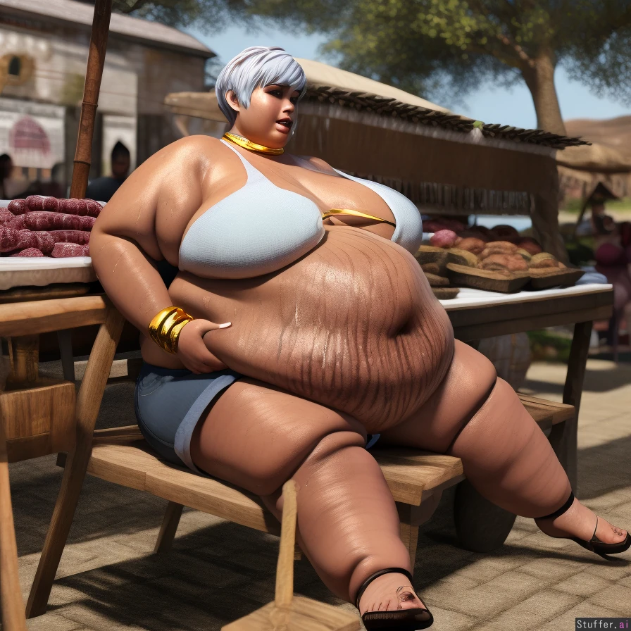 best quality, high rating, (masterpiece), (HD 4k resolution), (highly detailed), (3D render), perfect anatomy, (side angle), realistic proportions, solo, full body, ((Obese elena(street fighter))), huge round unflattering belly, about to pop, bloated, sagging belly, big lovehandles, (detailed fat face, double chin, detailed large eyes with pupils), flabby arms, narrow_hips, stretchmarks on her skin, plump_lips, brown_skin, white_hair, (pixiecut short hair), (wearing white cloth bikini), (moobs), sagging bellybutton, gold bracelets, gold choker, African, obese_thighs, obese_feet, obese_hands, sweaty, (Sitting leaning_back relaxing in an outdoor market, out of breath),