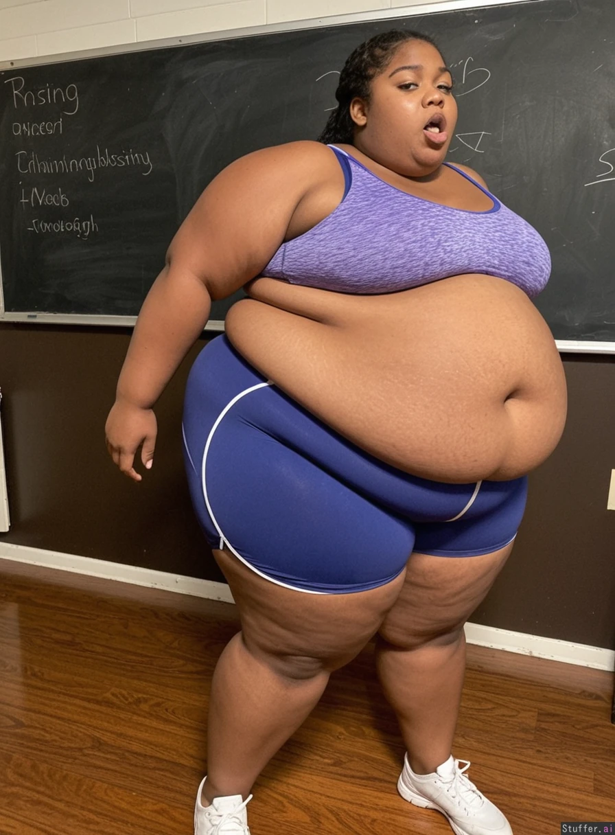 extremely enormously dangerously monstrously hyper disgustingly life-threateningly morbidly obese short young black ussbbw girl with tons and tons of stretch marks in tight sports bra and booty shorts struggling to waddle to class, impossibly dangerously inhumanly hyper obese amorphous shapeless blob girl, gigantic obese hanging belly covered in stretch marks, mouth breathing, gasping for air, pretty face, waddling gait,