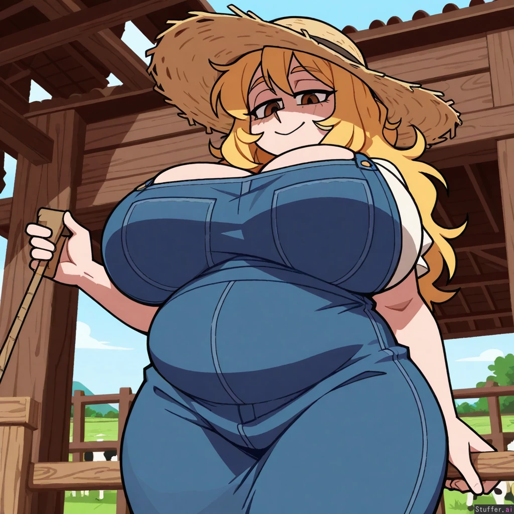 Vanripper_(artist) Strawberry blonde hair, long hair, messy hair, farm clothing, brown eyes, Bbw, (mature woman), chubby female, chubby cheeks, hyper breasts, chubby belly, bottomheavy, Standing, smile, straw hat, wide angle, cow in background, farm background