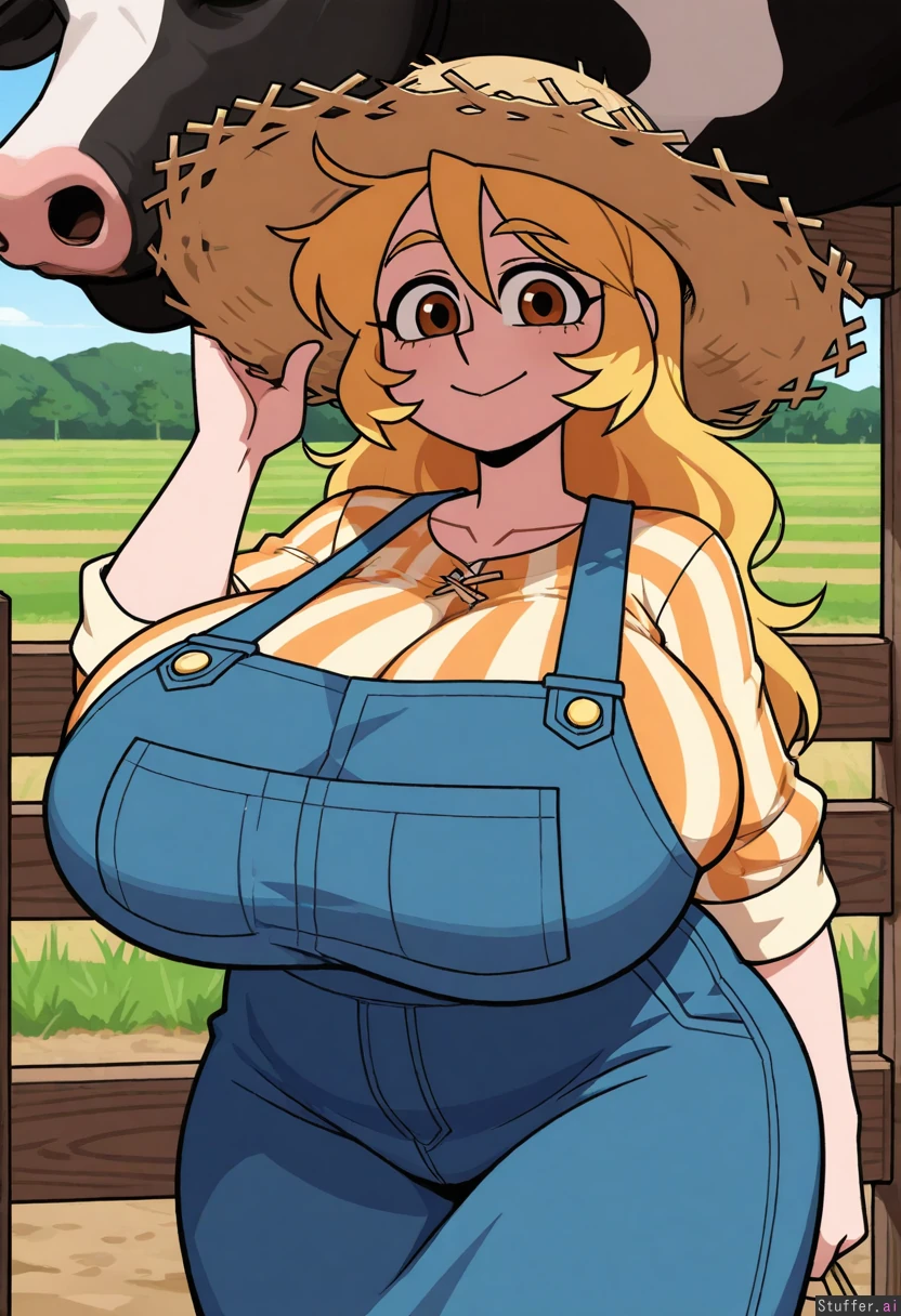 Vanripper_(artist) Strawberry blonde hair, long hair, messy hair, farm clothing, brown eyes, Bbw, (mature woman), chubby female, chubby cheeks, (hyper breasts), chubby belly, bottomheavy, Standing, inviting smile, straw hat, wide angle lens, cow in background, farm background