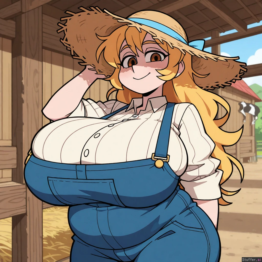 Vanripper_(artist) Strawberry blonde hair, long hair, messy hair, farm clothing, brown eyes, Bbw, (mature woman), chubby female, chubby cheeks, (hyper breasts), chubby belly, bottomheavy, Standing, inviting smile, straw hat, wide angle lens, cow in background, farm background