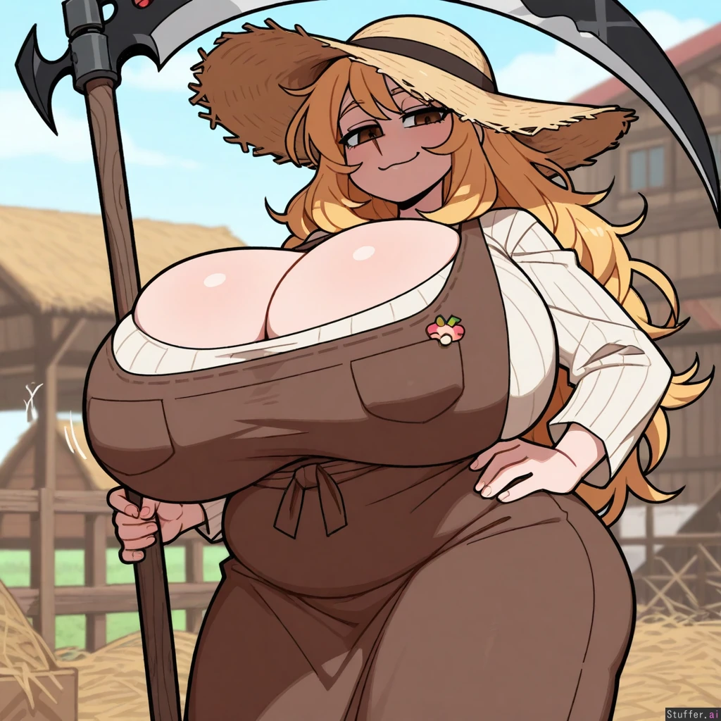 Vanripper_(artist), intricate details, best quality, high rating, best quality, high rating, best quality, high rating, best 8sexy%2gh rating, best quality, high rating,c.cu(artist), best quality, high rating, Strawberry blonde hair, long hair, messy hair, farm clothing, brown eyes, Bbw, (mature woman), chubby female, chubby cheeks, (huge breasts), (hyper breasts), chubby belly, bottomheavy, Standing, (smug smile), straw hat, holding scythe, wide angle lens, animals in background, farm background