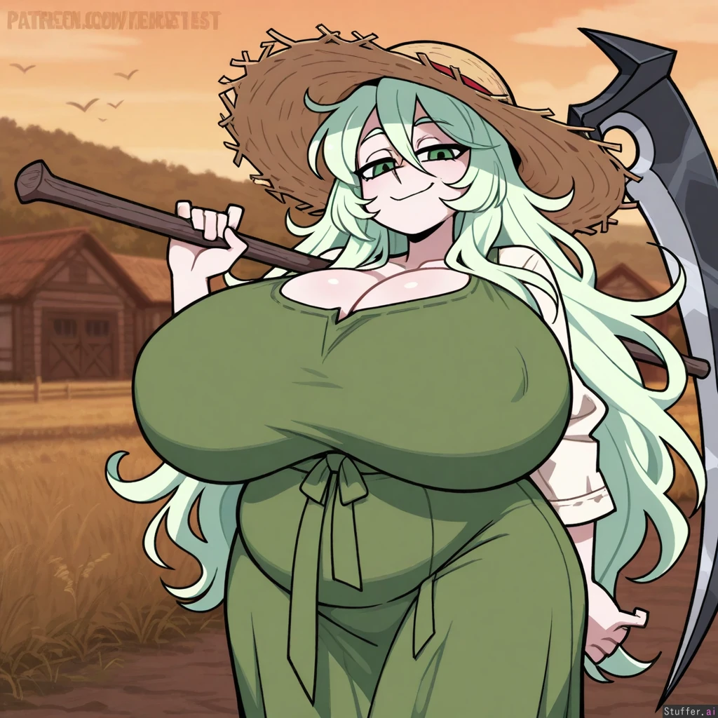 Vanripper_(artist), intricate details, best quality, high rating, best quality, high rating, best quality, high rating, best 8sexy%2gh rating, best quality, high rating,c.cu(artist), best quality, high rating, light green hair, long flowing hair, messy hair, ((wide hair)), modest farm clothing, green eyes, Bbw, (mature woman), (wide body), robust body, pale skin, chubby female, chubby cheeks, ((huge breasts)), (hyper breasts), chubby belly, bottomheavy, Standing, (smug smile), straw hat, holding scythe, wide angle picture, animals in background, farm background