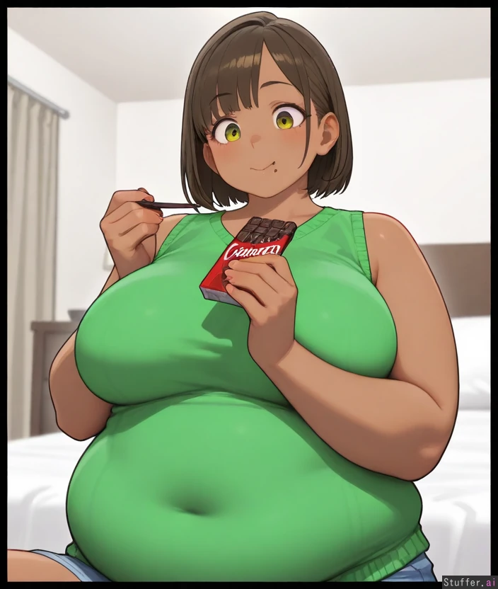 brown_hair, ((brown_skin)), yellow_eyes, short_hair, straight_hair, overweight_female, fat_belly, happy, eating, chocolate_bar, green_sweater_vest, bedroom, cute, gorgeous, milf, full_body