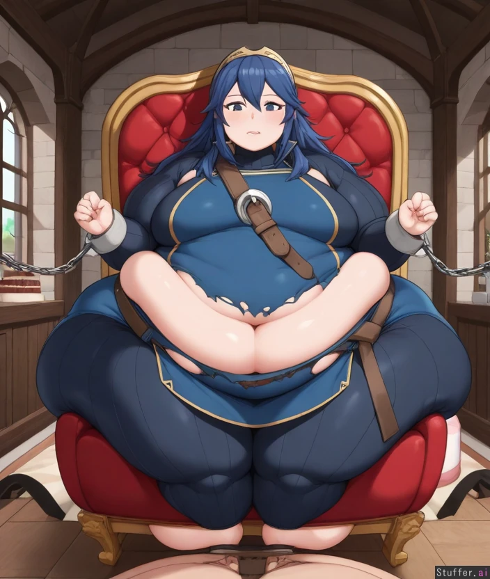 lucina_(fire_emblem), fat_belly, mature_female, wide_hips, belly_bursting_out_of_clothes, slob, overstuffed, castle_interior, basement, hands_up, chains, handcuffed, bondage, force_feeding, cake_slice, (((obese_belly, pov, morbidly_obese_female, bellyheavy, slob, weight gain, extreme obesity))), ripped_clothing, sex_slave, standing, mind_break, big_breasts