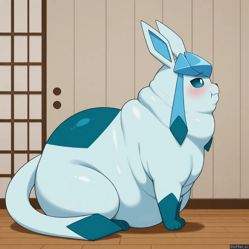 Solo, highly detailed, masterpiece, Orukaniumu(artist), Nawataro(artist), (monstrously obese round glaceon, monstrously obese face), (monstrously obese round cat_anatomy:1.2), (monstrously obese neck roll), quadrupedal, 3 quarters side view, blushing, cozy carpeted floor,