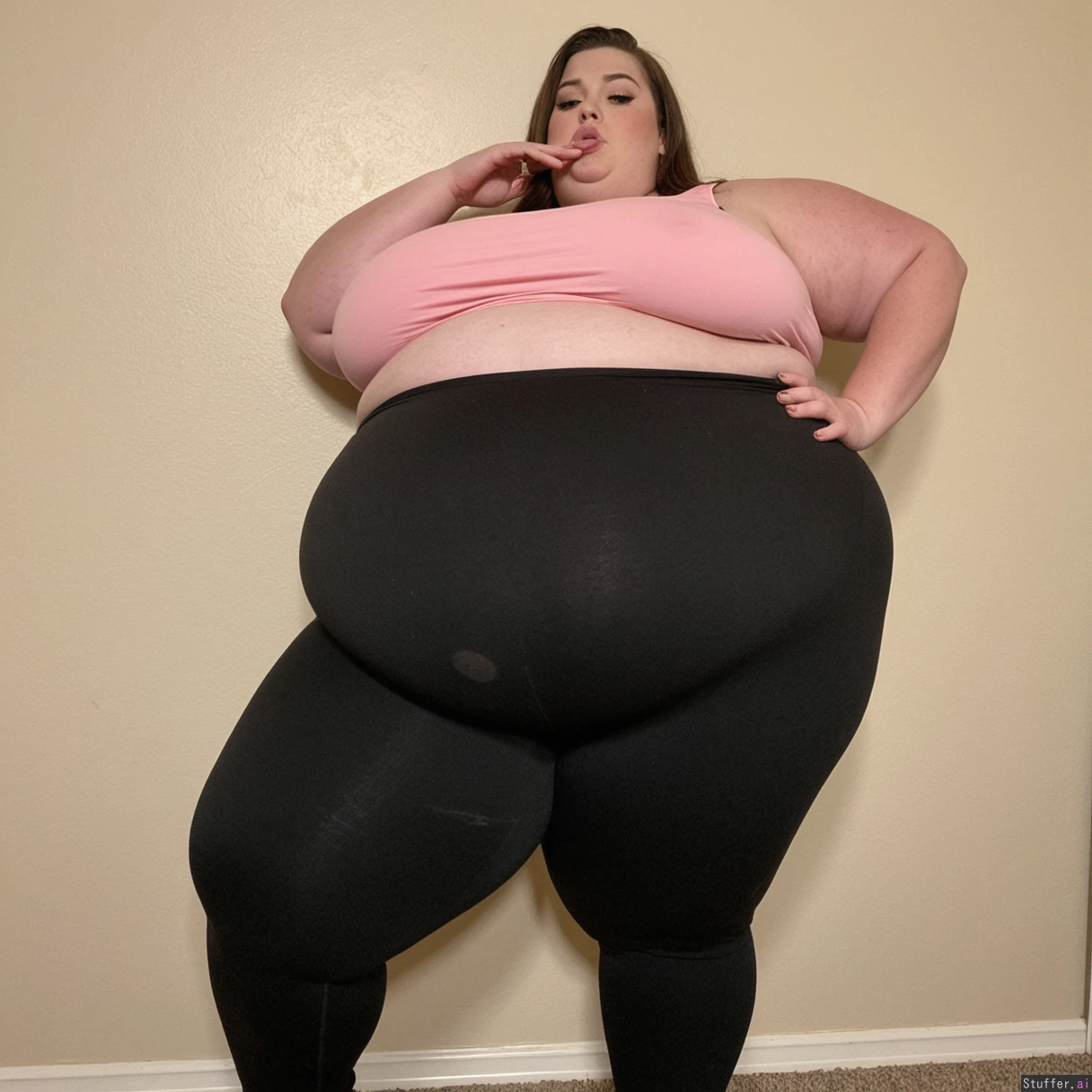 beautiful ssbbw with massive overstuffed belly, high waisted stretch pants, pouting