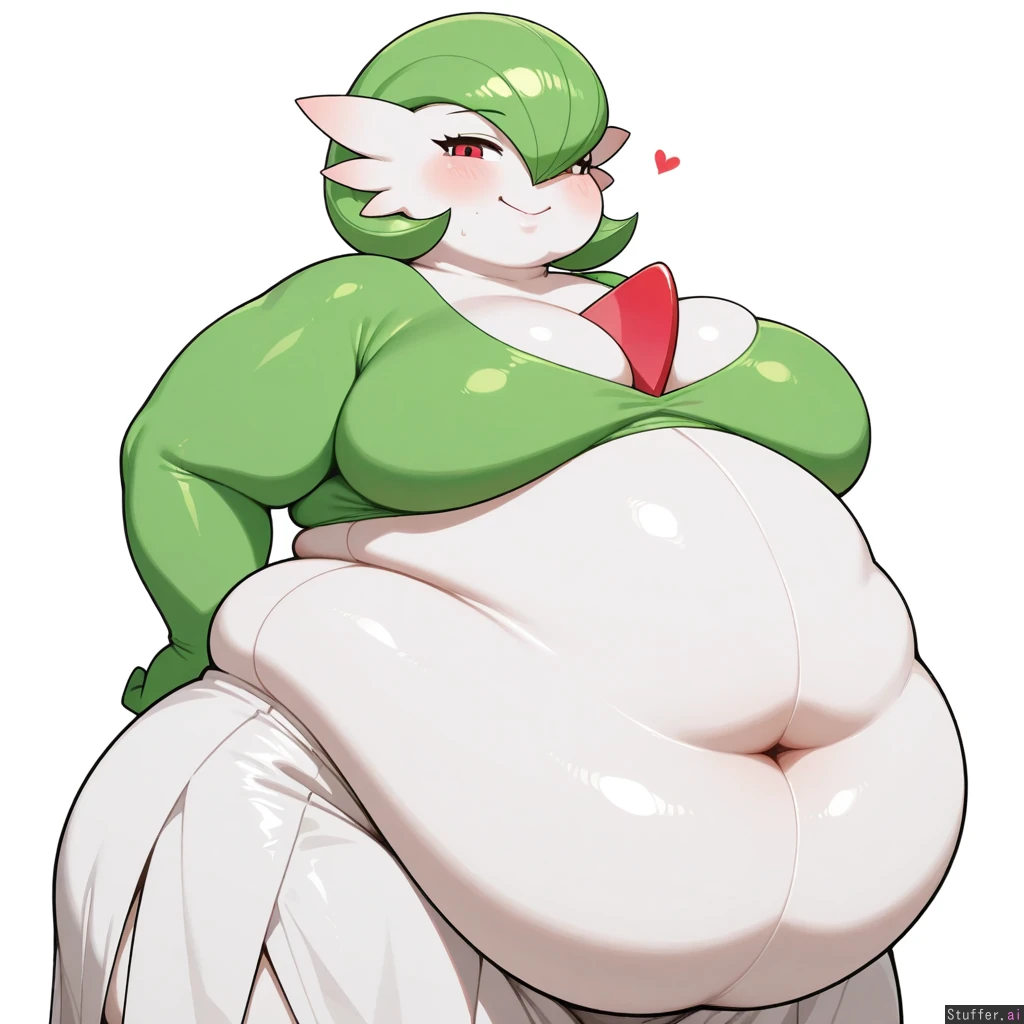 1 Girl, Gardevoir, Green Hair, Tight Dress, (Obese, Fat Rolls, Huge Belly, Fat Chin, Fat Cheeks:1.2), White Background, Seductive Pose, Flirty Smile,