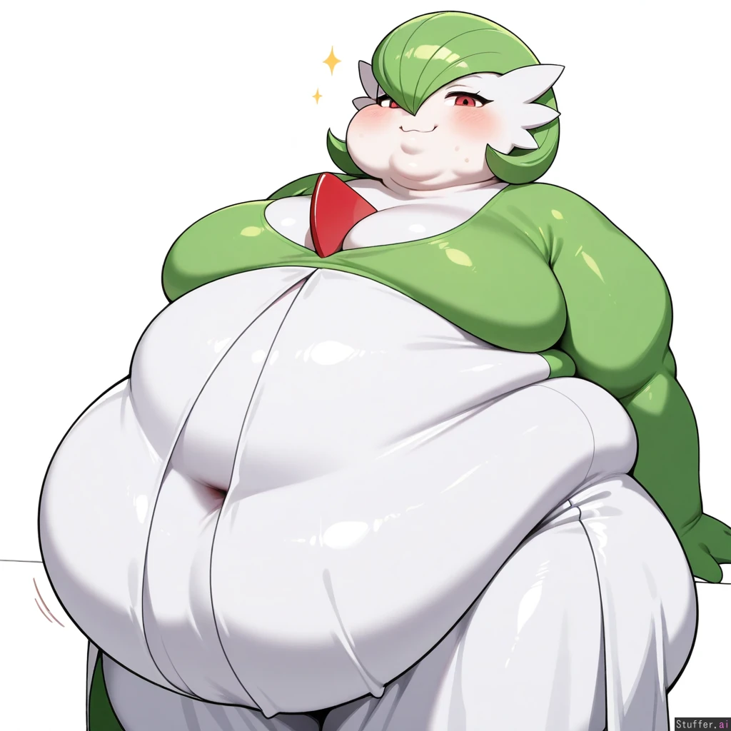 1 Girl, Gardevoir, Green Hair, Tight Dress, (Obese, Fat Rolls, Huge Belly, Fat Chin, Fat Cheeks:1.4), White Background, Seductive Pose, Flirty Smile,