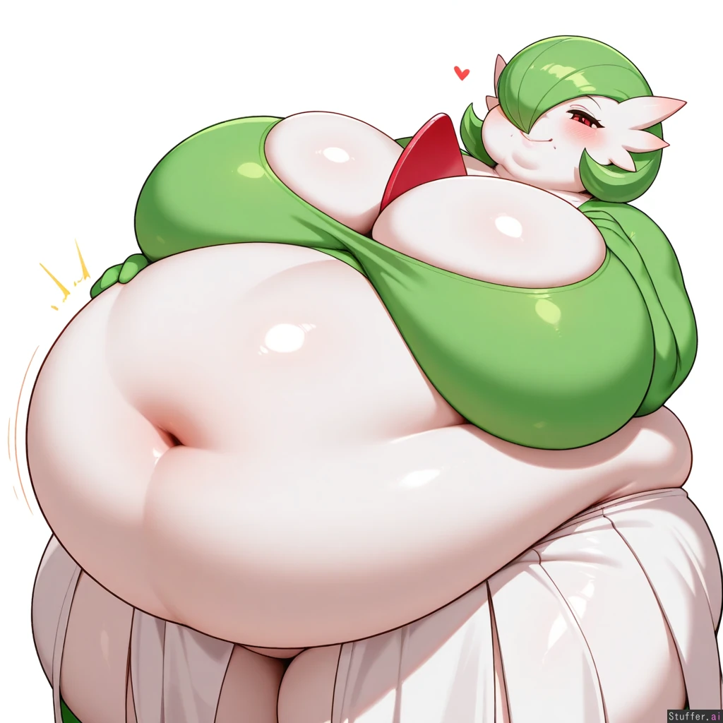 Kipteitei, 1 Girl, Gardevoir, Green Hair, (Obese, Fat Rolls, Huge Belly, Fat Chin, Fat Cheeks, Huge Breasts, Bloated Belly:1.3), White Background, Seductive Pose, Flirty Smile,
