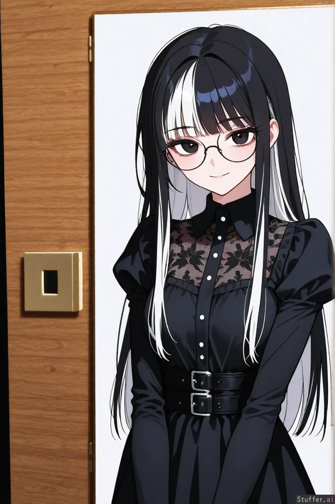 Manhwa, 1 Girl, Goth girl, Black Hair, White Hair highlights, Long Hair, Black Dress, Shoulderless Dress, Glasses, Slim, Flirty Smile, White Background,