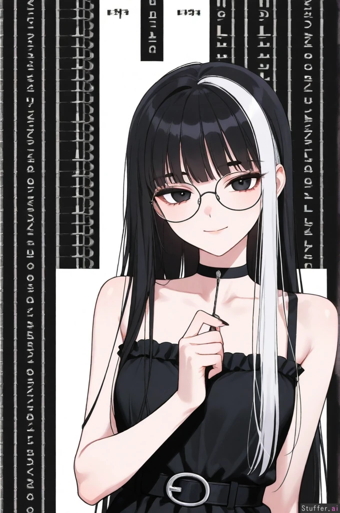 Manhwa, 1 Girl, Goth girl, Black Hair, White Hair highlights, Long Hair, Black Dress, Shoulderless Dress, Glasses, Slim, Flirty Smile, White Background,