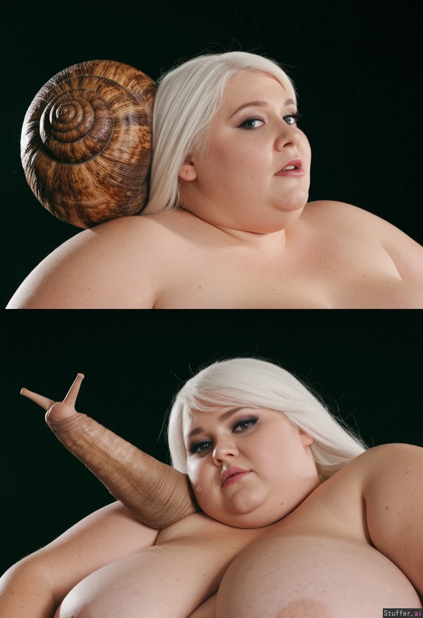 Obese woman with white hair transforms into a snail. Cinematic effects.