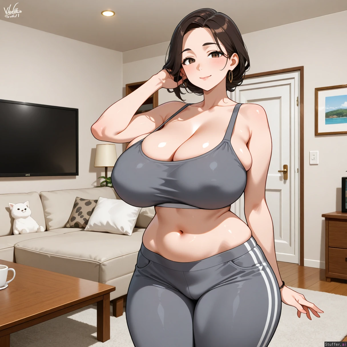 best quality, high rating, high detail, 1girl, solo, detailed background, living room, 2 women, 2 woman, mature, 1 latino, 1 asian, (activewear, breasts barely contained, (deep cleavage, voluptuous, slim waist), (giant perky breasts:1.5), (wide hips:1.3), (flat belly:1.1), small smile,