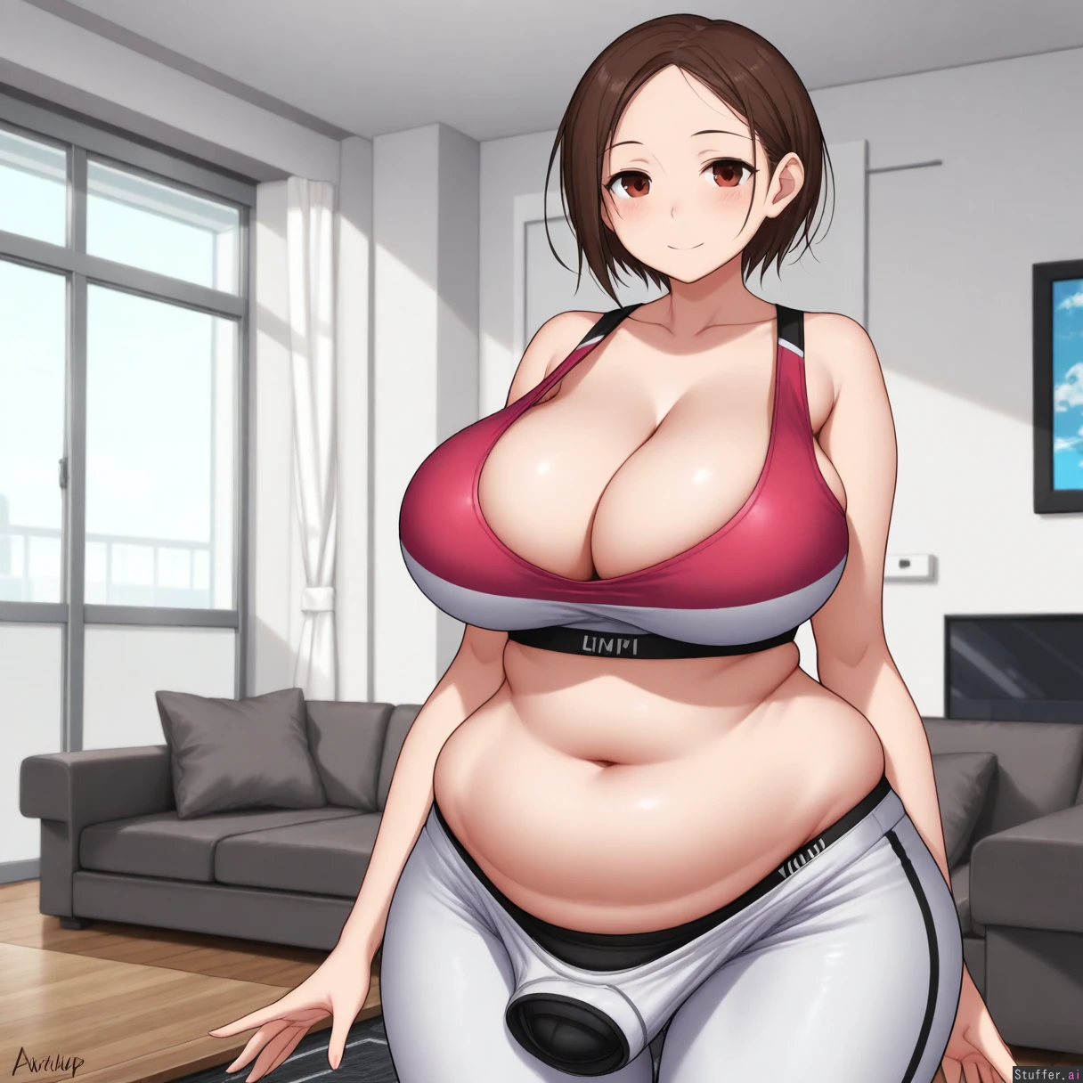 best quality, high rating, high detail, 1girl, solo, detailed background, living room, 1 woman, mature, (activewear, breasts barely contained, (deep cleavage, voluptuous, slim waist), (giant perky breasts:1.5), (wide hips:1.3), small smile, (obese:1.6)