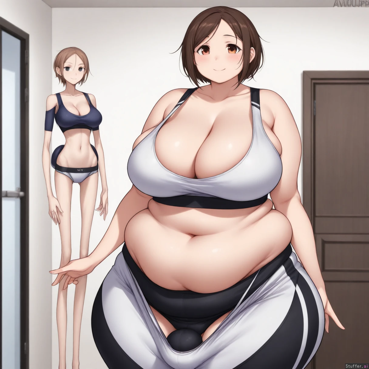 best quality, high rating, high detail, 1girl, solo, detailed background, living room, 1 woman, mature, (activewear, breasts barely contained, (deep cleavage, voluptuous, slim waist), (giant perky breasts:1.5), (wide hips:1.3), small smile, (extremely obese:1.6)