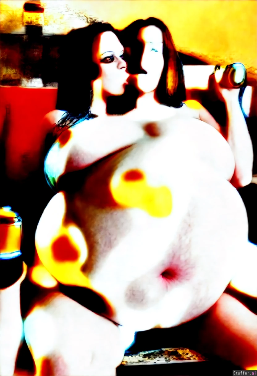 (Hyper belly:2.5) (sagging belly:2.5) Two thin women sitting side by side beer drinking contest Holding belly Drinking party Drunk