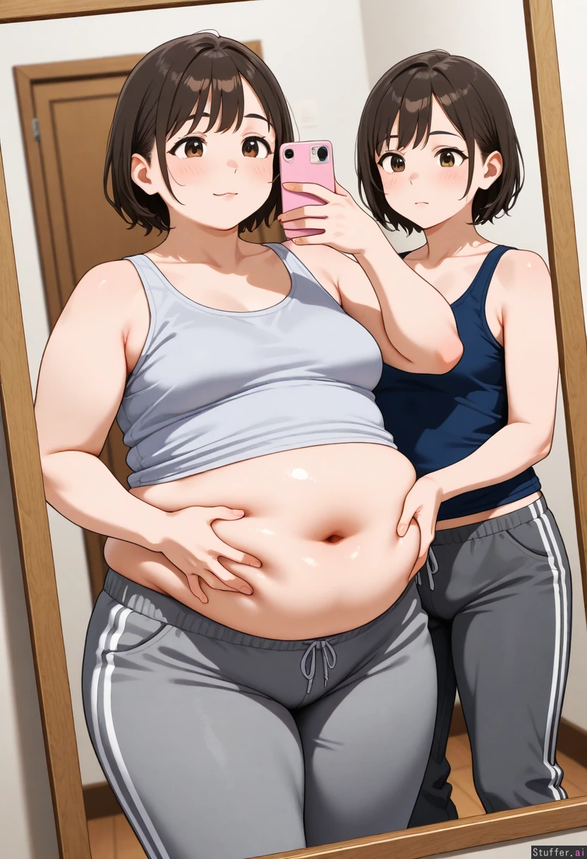 22 year old college girl, mature, sweatpants, tank top, obese, small_breasts, big_belly, taking a picture of herself in a mirror, one hand grabbing her belly
