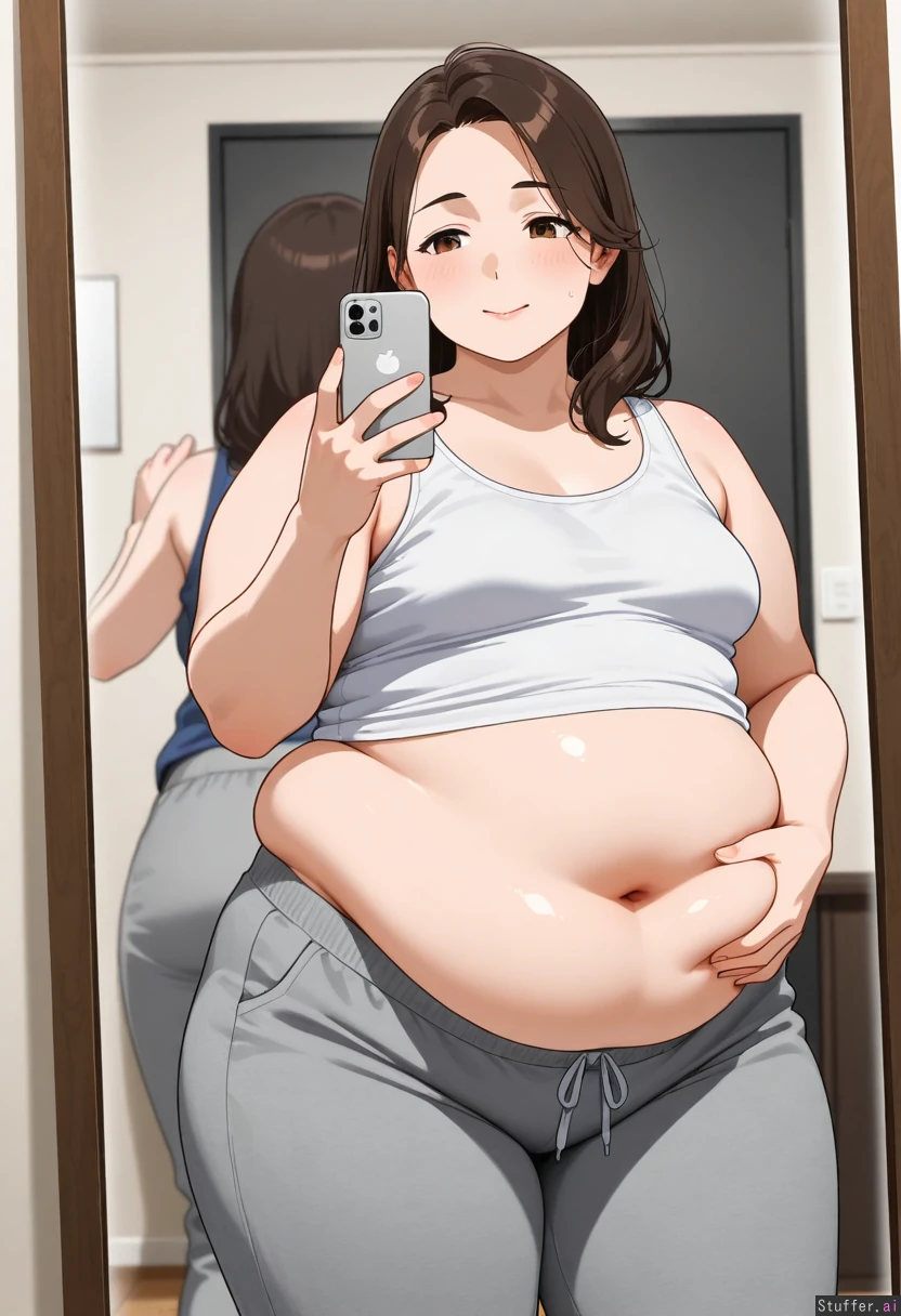 22 year old college girl, mature, sweatpants, tank top, obese, small_breasts, big_belly, taking a picture of herself in a mirror, belly is hanging over her pants, one hand grabbing her belly