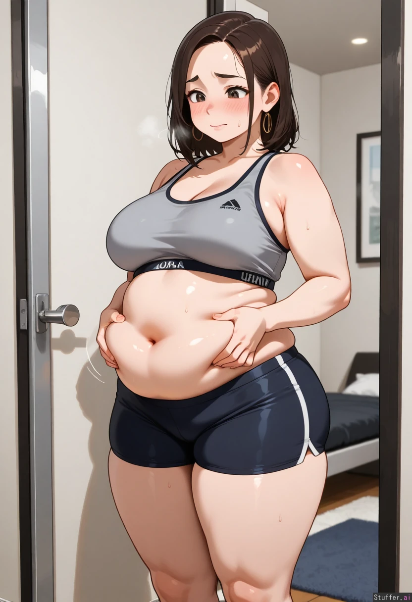 Hot young Latina woman, athletic shorts and a sports bra, chubby, squeezing her belly pudge, embarrassed