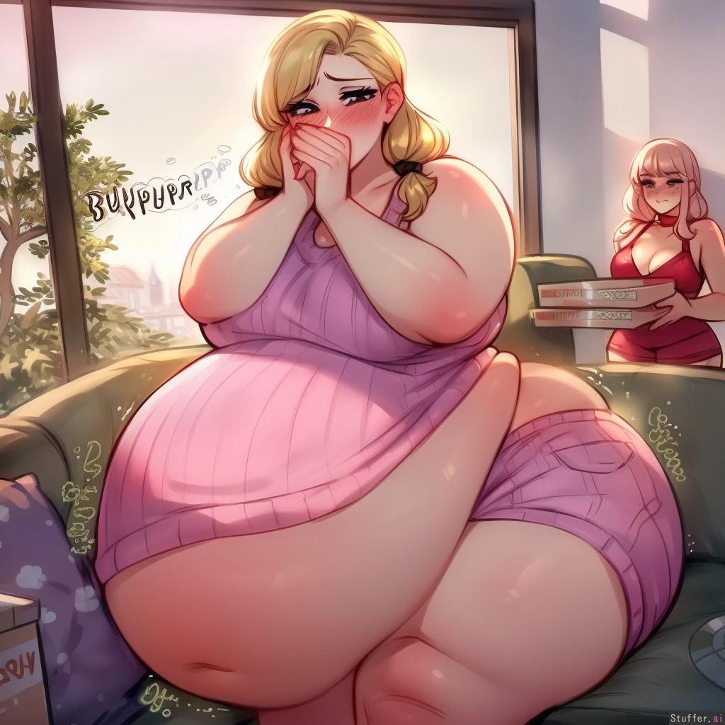 best quality, high rating, best quality, high rating, (best quality), (high rating), absurd res, high res, detailed, ultra quality, ((high quality)), masterpiece, (ultra high resolution), anime style, stunning beauty, detailed face, intricate detail, sophisticated detail, cute face, exquisite detail, absurd resolution, correct anatomy, 8k, (highly detailed face), highly detailed skin texture, 1girl, long blonde hair, low pigtails, anime, ((milf)), blushyspicy(artist) spellsX(artist) c.cu(artist), ((living room)), embarrassed, ((((huge_hips:1.9)))), ((((massive hips)))), ((ultra_wide_hips)), ((hyper thick hips)), ((massive stuffed belly)), ((enormous belly)), (tank top, pajama shorts), thick waist, wide hips, (huge thighs), bottomheavy, (thick thighs), chubby_belly, fat rolls, (saggy big_belly:1.3), ((mouth very open, burp)), ((too full to move)), (((sitting on couch))), ((hands covering mouth)), (((eyes looking down, embarrassed))),((loud belly noises)), ((chubby arms)), ((round face)), ((head tilted back)), ((hanging belly)), (((pizza boxes on table))), (((several women rubbing her belly))), ((fat rolled massive underbelly:1.3))