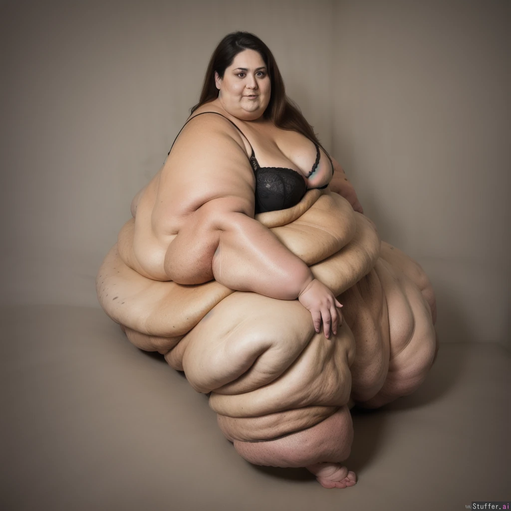 Photo realistic, highly detailed, realistic lighting, persianv ssbbw, sitting on a couch, beautiful face, brown hair:1.4, (wearing a black bra:1.4) , (ultra double chin:1.9), (ultra fat face:1.9), (super ultra huge arms:1.9), (ultra huge legs:1.9), ultra leg rolls:1.7, (ultra huge calves:1.8), (ultra cellulite:1.6), ultra fat ankles:1.8), bare feet:1.4