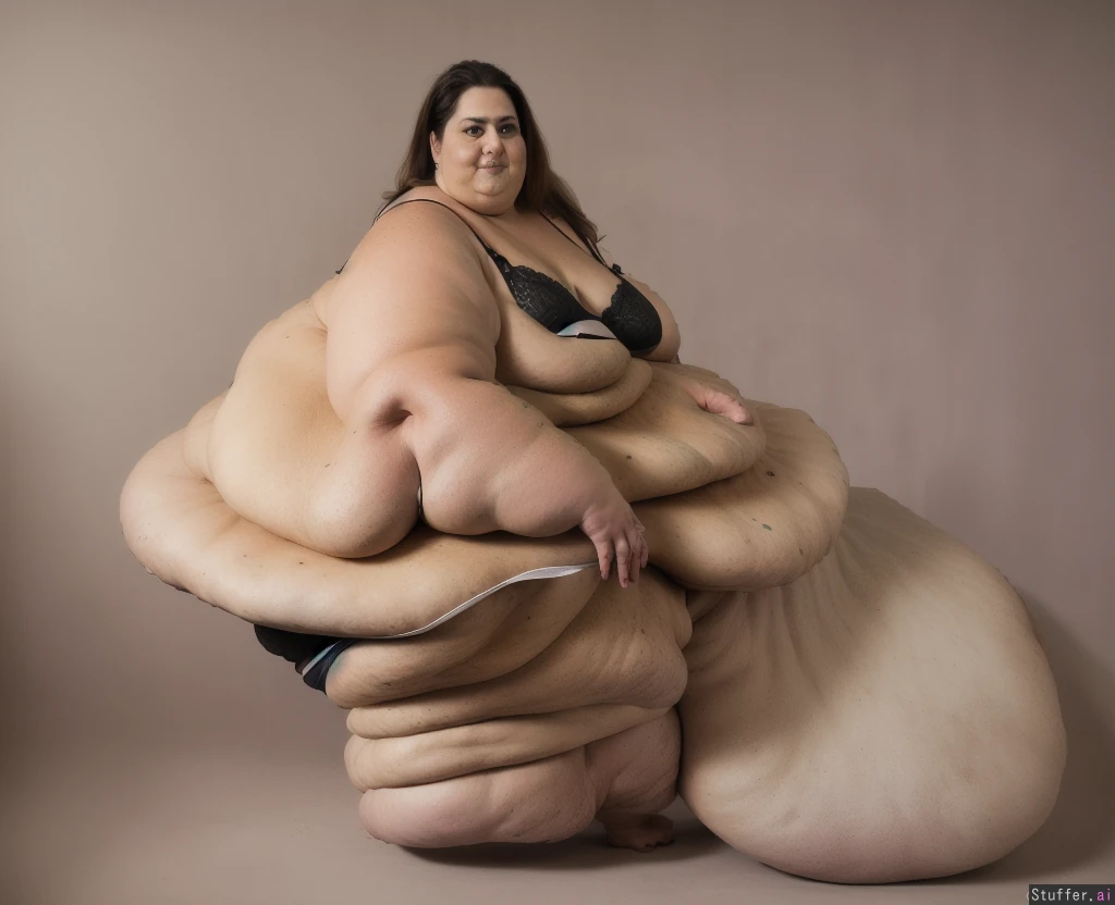 Photo realistic, highly detailed, realistic lighting, persian ssbbw, beautiful face, brown hair:1.4, (wearing a black bra:1.4) , (ultra double chin:1.9), (ultra fat face:1.9), (super ultra huge arms:1.9), (ultra huge legs:1.9), ultra leg rolls:1.7, (ultra huge calves:1.8), (ultra cellulite:1.6), ultra fat ankles:1.8), bare feet:1.4