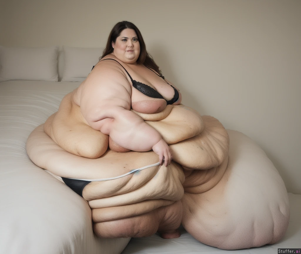 Photo realistic, highly detailed, realistic lighting, persian ssbbw, beautiful face, brown hair:1.4, (wearing a black bra:1.4) , (ultra double chin:1.9), (ultra fat face:1.9), (super ultra huge arms:1.9), (ultra huge legs:1.9), ultra leg rolls:1.7, (ultra huge calves:1.8), (ultra cellulite:1.6), ultra fat ankles:1.8), bare feet:1.4
