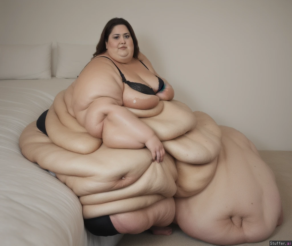 Photo realistic, highly detailed, realistic lighting, latina ssbbw, ultra immobile blob, beautiful face, brown hair:1.4, (wearing a black bra:1.4) , (ultra double chin:1.9), (ultra fat face:1.9), (super ultra huge arms:1.99), (ultra huge legs:1.9), ultra leg rolls:1.7, (ultra huge calves:1.8), (ultra cellulite:1.6), ultra fat ankles:1.8), bare feet:1.4