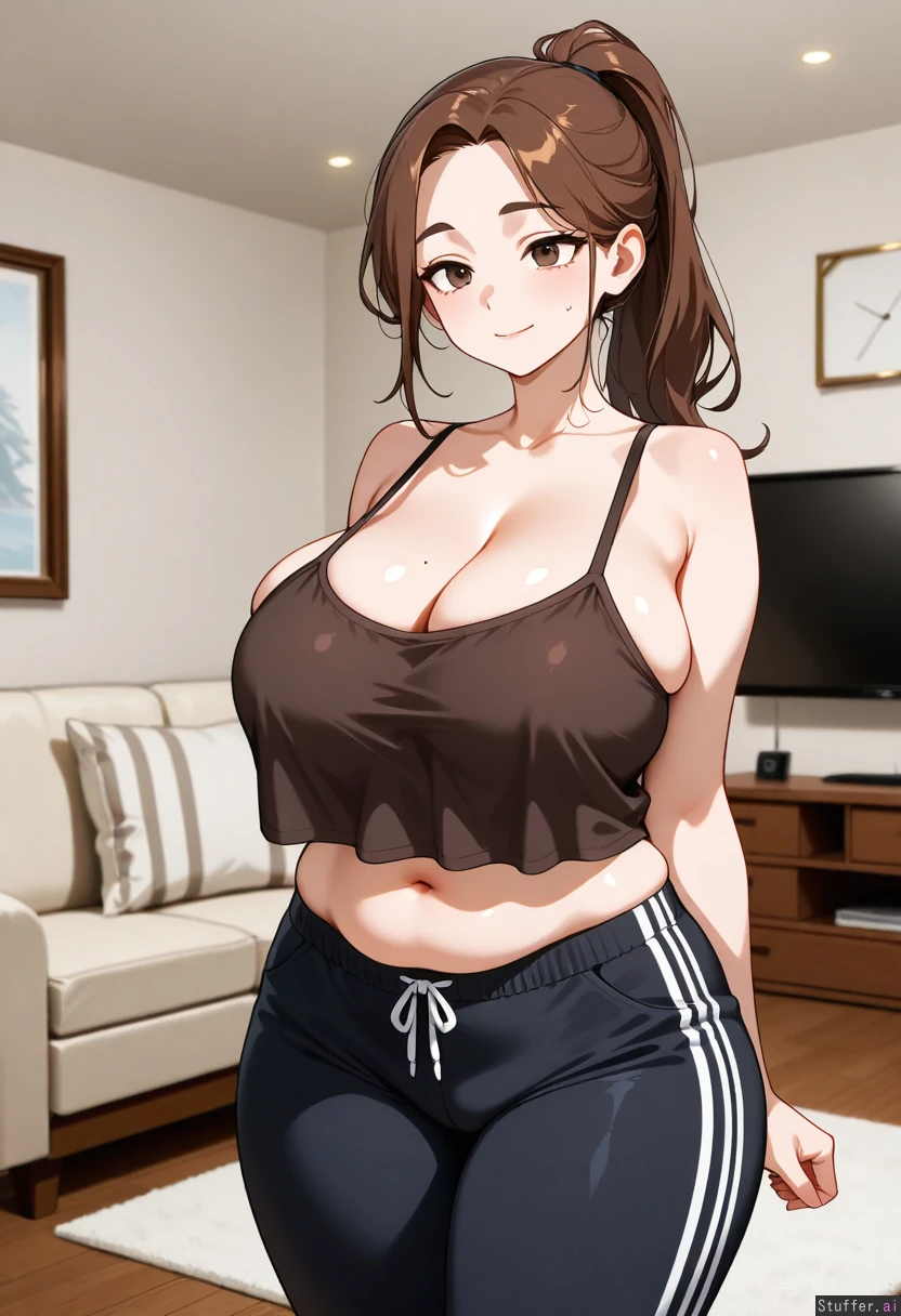 high detail, 1girl, solo, detailed background, living room, woman, mature, koreanrace, (Korean skin, brown ponytail hair, brown tired eyes), (dark camisole, top overhang, breasts barely contained, black sweatpants, (deep cleavage, voluptuous), (giant perky breasts:2.2), (wide hips:1.5), small smile, (bloated_belly:1.2), bursting_clothes