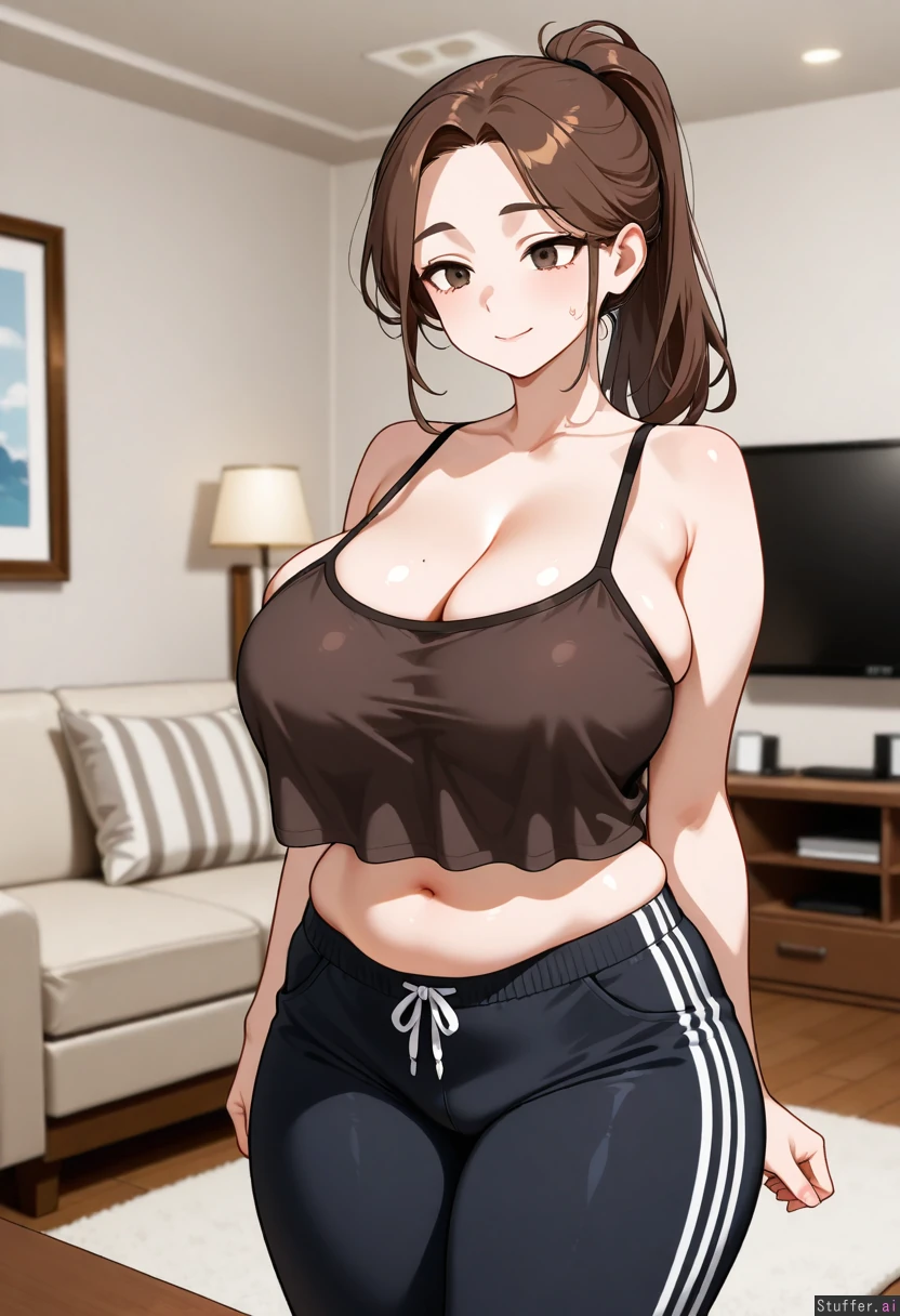 high detail, 1girl, solo, detailed background, living room, woman, mature, koreanrace, (Korean skin, brown ponytail hair, brown tired eyes), (dark camisole, top overhang, breasts barely contained, black sweatpants, (deep cleavage, voluptuous), (massive perky breasts:2.2), (massive wide hips:1.8), small smile, (bloated_belly:1.2), bursting_clothes