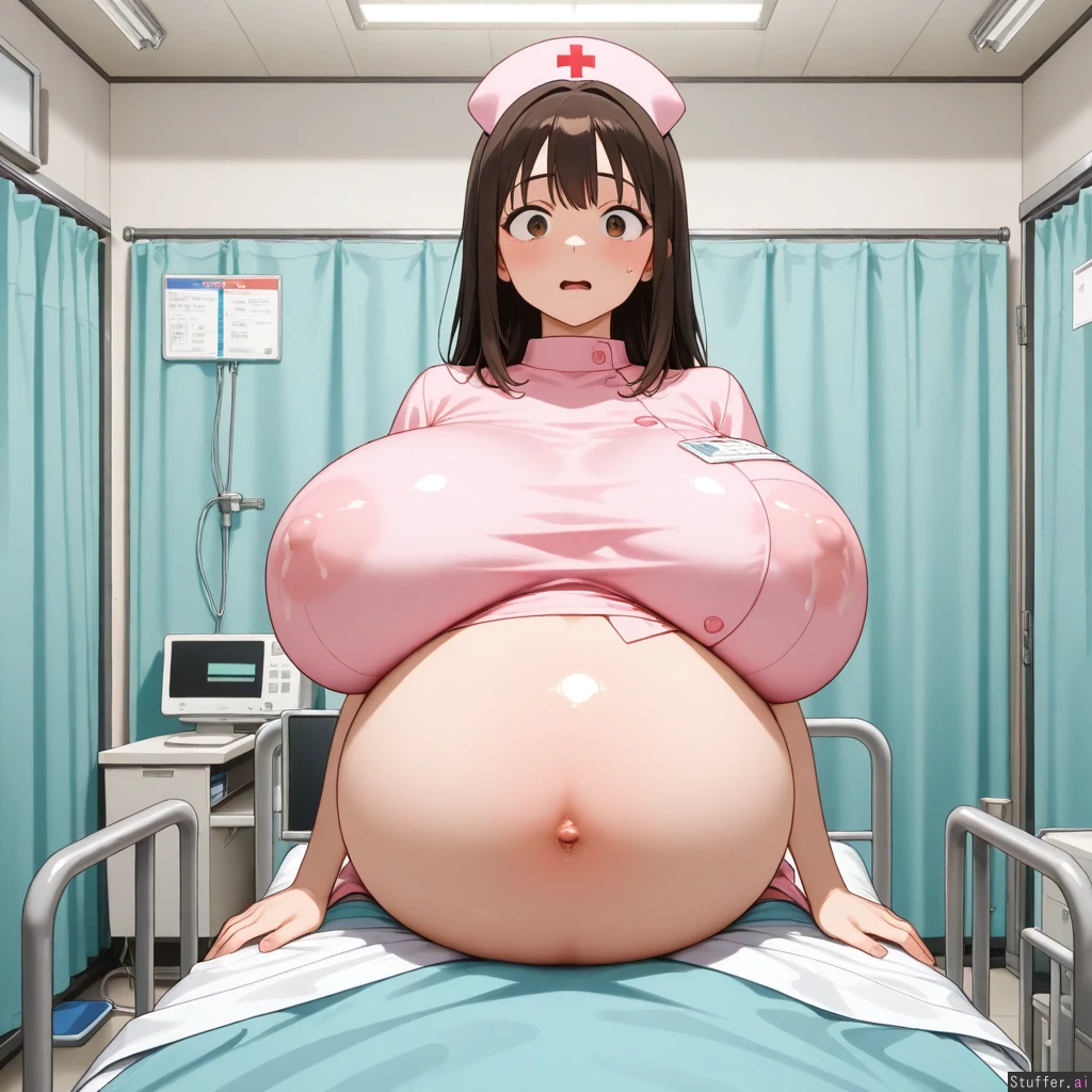 Hospital, examination room, hospital bed. Attractive, nurse, brunette, shocked expression. (Breast inflation:1.8) lactating through nipples and clothes Examining an enormous, growing penis