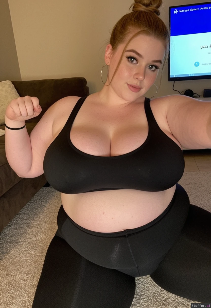 Perfect anatomy, perfect 25 year old slim face, ginger, messy bun, hoop_earrings, curvy, high waisted black leggings, black sports bra on, living room, (huge wide hips and big thick thighs), ((flabby belly hanging out)) huge heavy breasts, cleavage, selfie with top down view