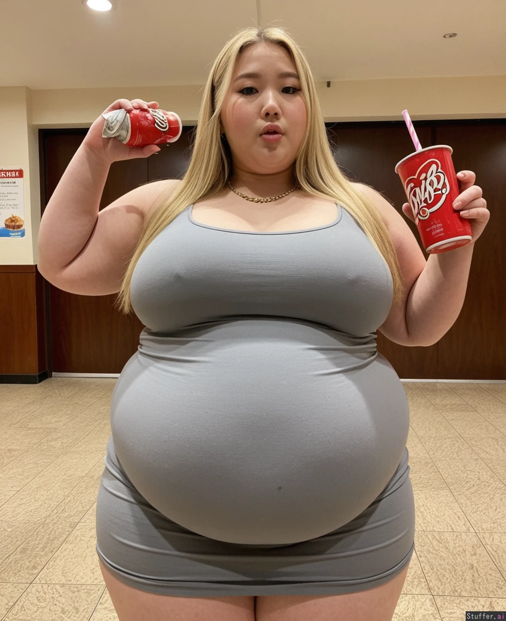 Beautiful young ssbbw in stretchy light graydress. Blonde hair. Fattest girl in her college. Korean girl, gorgeous face, super model face Necklace Standing by theater lobby Sipping large soda Ssbbw Juicy plump arms Very wide hips Very thick thighs Huge belly