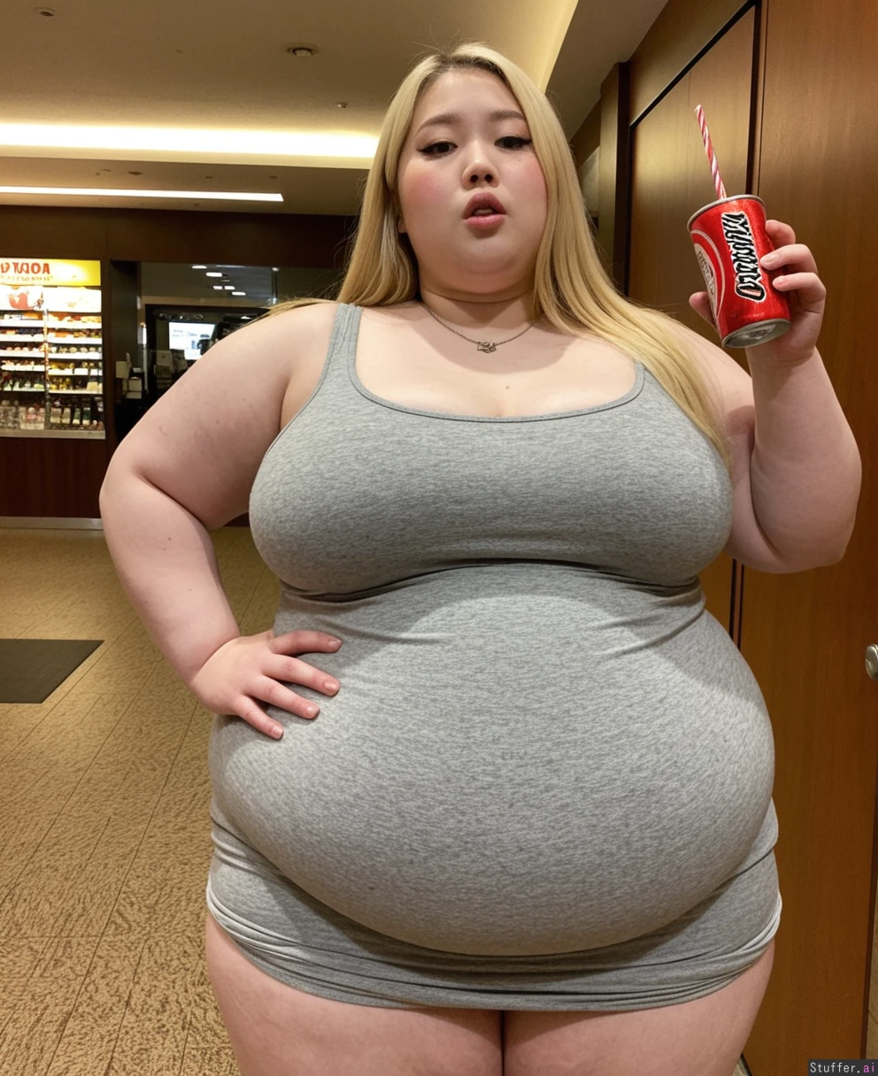 Beautiful young ssbbw in stretchy light graydress. Blonde hair. Fattest girl in her college. Korean girl, gorgeous face, super model face Necklace Standing by theater lobby Sipping large soda Ssbbw Juicy plump arms Very wide hips Very thick thighs Huge belly
