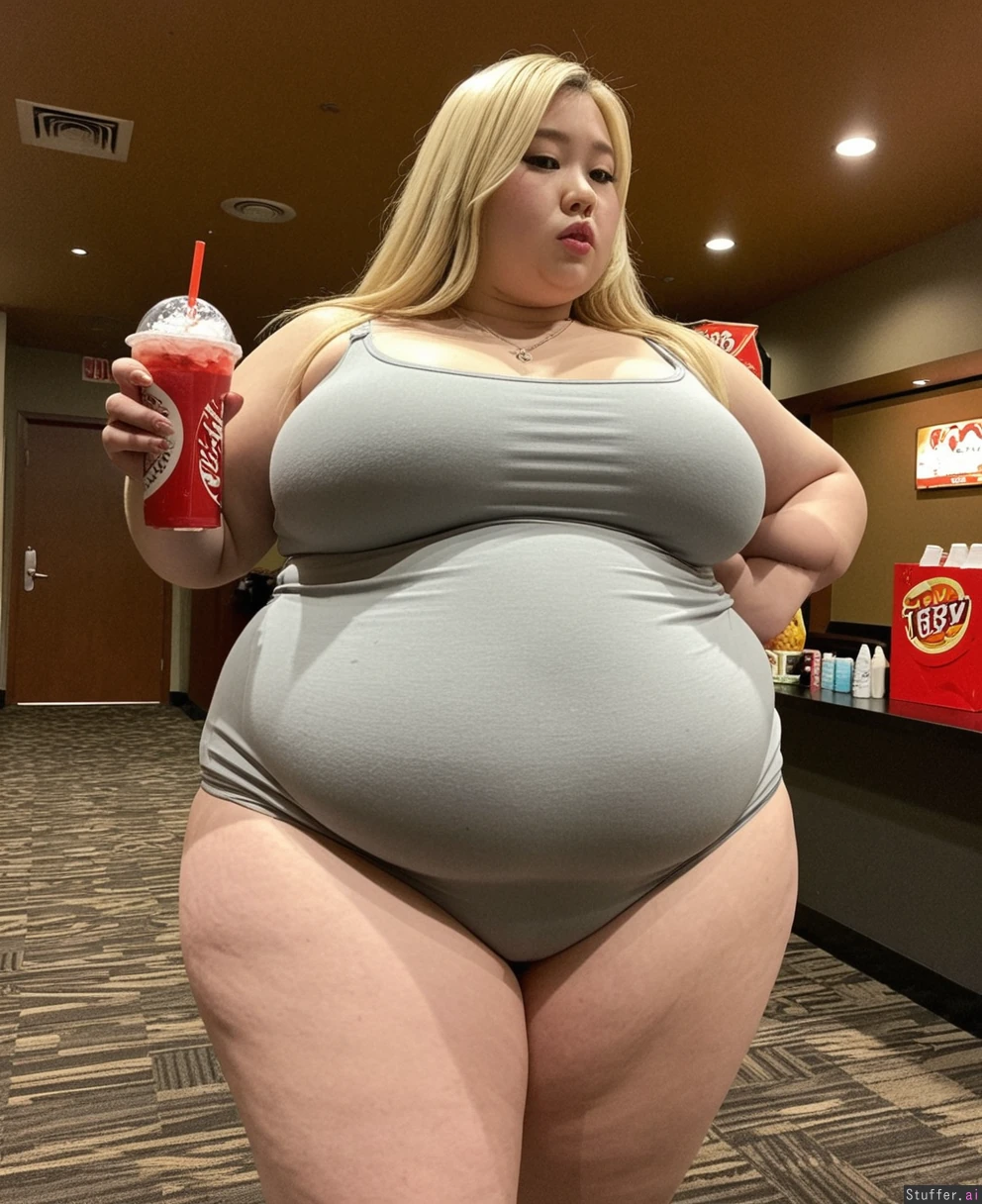 Beautiful young ssbbw in stretchy light graydress. Blonde hair. Fattest girl in her college. Korean girl, gorgeous face, super model face Necklace Standing by theater lobby Sipping large soda Ssbbw Juicy plump arms Very wide hips Very thick thighs Huge belly