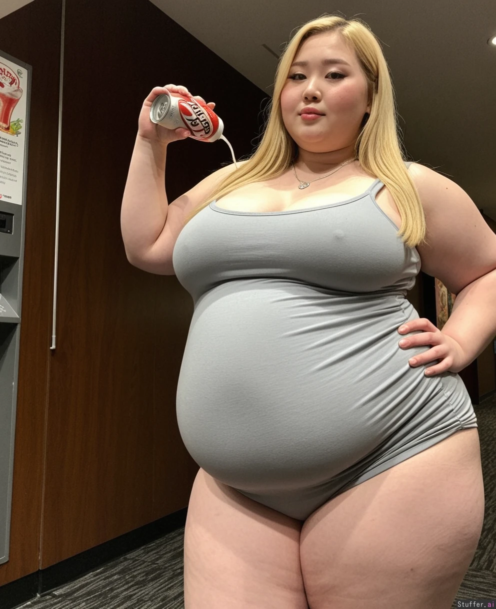 Beautiful young ssbbw in stretchy light graydress. Blonde hair. Fattest girl in her college. Korean girl, gorgeous face, super model face Necklace Standing by theater lobby Sipping large soda Ssbbw Juicy plump arms Very wide hips Very thick thighs Huge belly