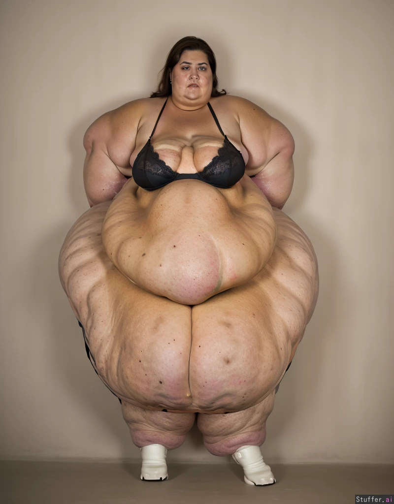 Photo realistic, highly detailed, realistic lighting, latina ssbbw, standing, beautiful face, brown hair:1.4, (wearing a black bra:1.4) , (ultra fat face:1.9), (ultra double chin:1.9, (ultra fat face:1.8), ultra huge arms:1.9), (ultra huge legs:1.9), ultra leg rolls:1.7, (ultra huge calves:1.8), (ultra cellulite:1.6),