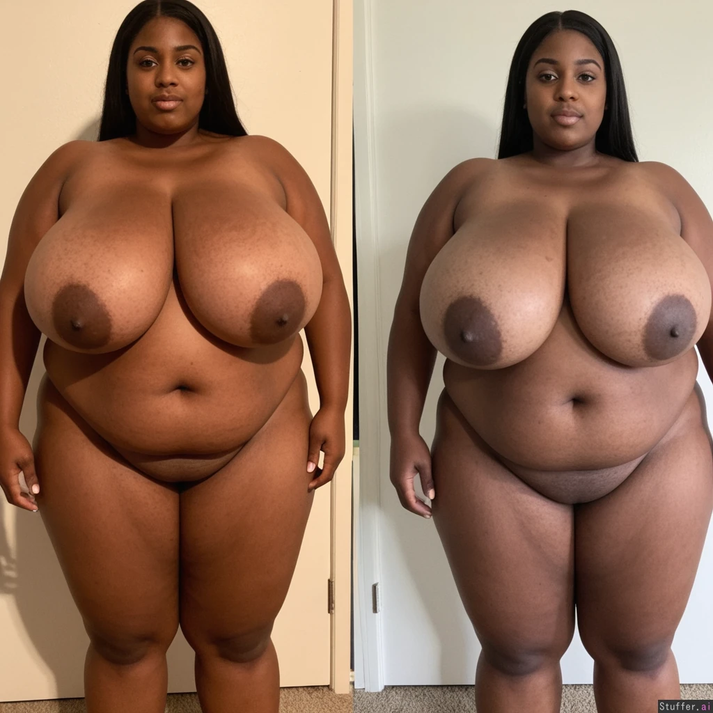 body inflation, lactating, massive tits, dark skin tones, weight gain, (expanding bigger:1.8), (growing bigger tits:1.8), bigger_body, growing fatter and bigger each strip, weight increase, sexy, full body expansion, growth comparison, growing bigger and gaining weight starting slim and becoming extremely obese, full body photo, jelly thighs