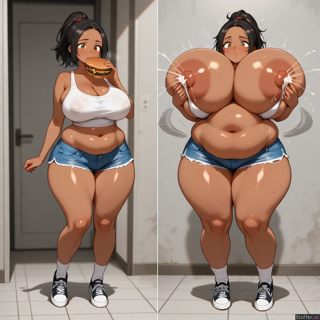 body inflation, lactating, massive tits, dark skin tones, african american, weight gain, (expanding bigger:1.8), (growing bigger tits:1.4), growing fatter, weight increase, sexy, full body expansion, growth comparison, growing bigger and gaining weight, before slim, after massively obese, full body photo, enormous thighs, huge belly rolls, eating a delicious burger gaining weight_conscious, ridiculous amount of weight gain