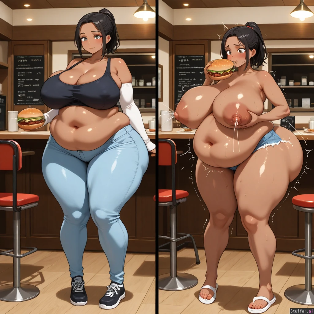 body inflation, lactating, massive tits, dark skin tones, african american, weight gain, (expanding bigger:1.8), (growing bigger tits:1.4), growing fatter, weight increase, sexy, full body expansion, growth comparison, growing bigger and gaining weight, before slim, after massively obese, full body photo, enormous thighs, huge belly rolls, eating a delicious burger gaining weight_conscious, ridiculous amount of weight gain, scared expression, ass inflation, restaurant
