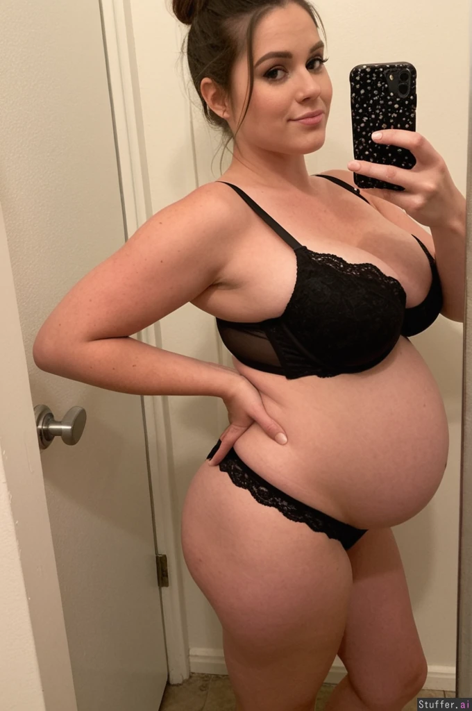 sexy, attractive, round face, square jaw, pregnant early 20's, momma in bathroom, selfie, gigantic_breasts, black lingerie, full body, posing with ass forward