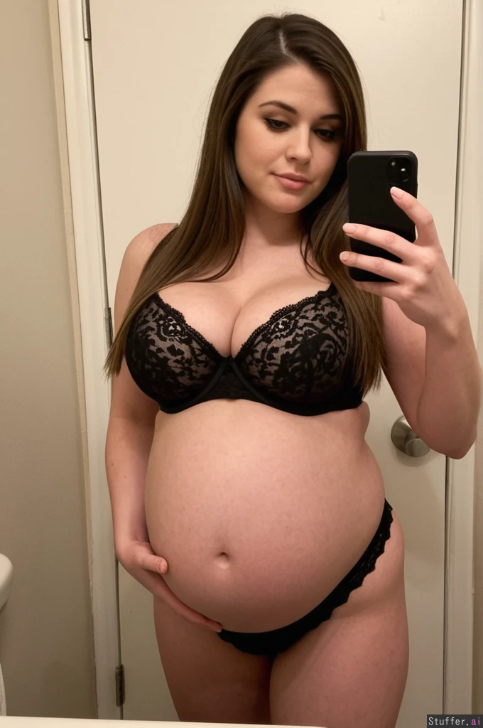 sexy, attractive, round face, square jaw, pregnant early 20's, momma in bathroom, selfie, gigantic_breasts, black lace lingerie, full body, showing pregnant belly, smooth skin, brunette, long hair, greek