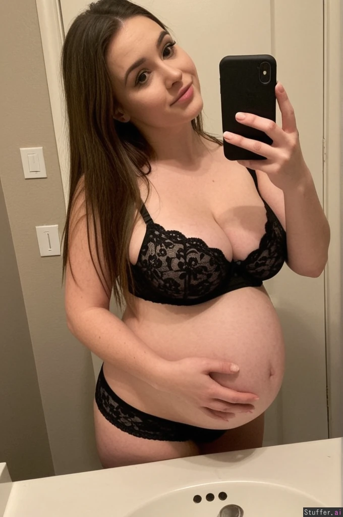 sexy, attractive, round face, square jaw, heavily pregnant early 20's, momma in bathroom, selfie, gigantic_breasts, black lace lingerie, full body, showing pregnant belly, smooth skin, brunette, long hair, greek