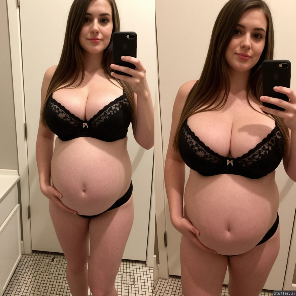 sexy, attractive, round face, square jaw, heavily pregnant early 20's, momma in bathroom, selfie, gigantic_breasts, black lace lingerie, nursing bra, full body, showing pregnant belly, smooth skin, brunette, long hair, greek, huge cleavage