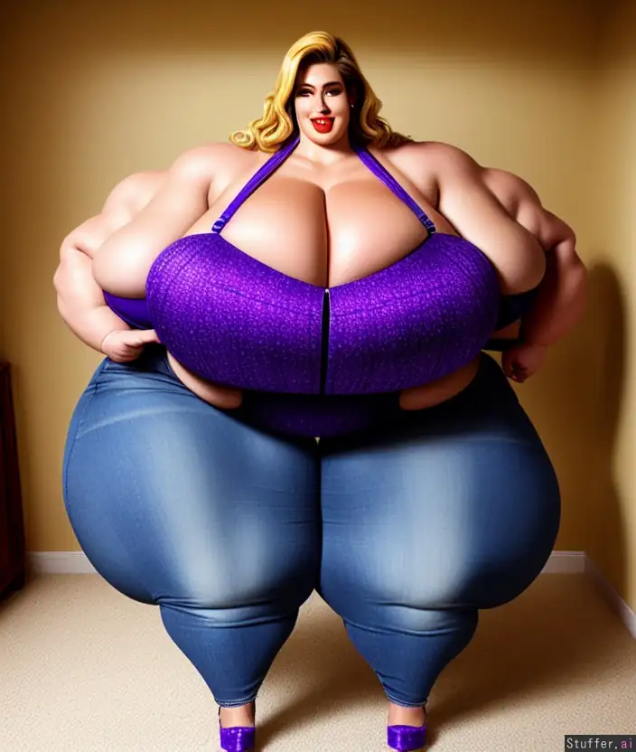 (1 person), (gigantic hot fat girl), ((super beautiful skinny young face)), massive red lips, smiling, huge blue beautiful eyes, (eyelashes), (long wavy very bright all blonde hair), hyper wide strong shoulders, (hyper huge perky breasts:1.672), (long cleavage:1.69), (small belly:1.32), (gigantic thicc thighs:1.4),(humongous hyper ass:1.42), (sexy wide hips:1.59), (big thick strong arms:1.5), (small Purple bra), blue jeans, high heels, bedside
