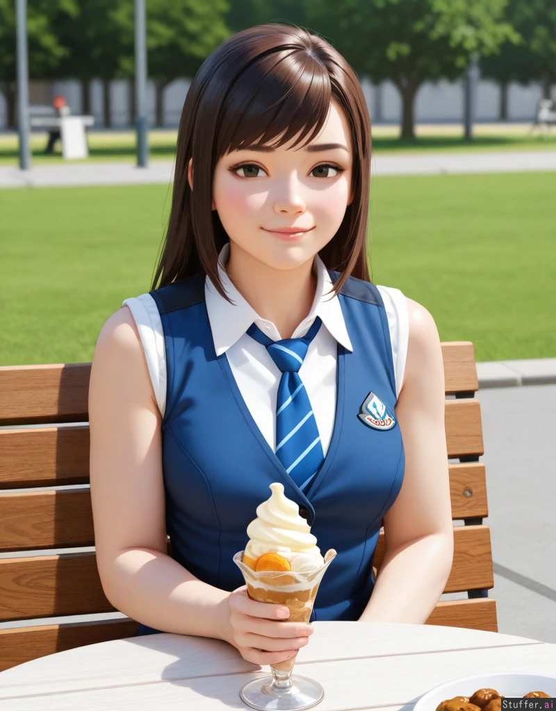 Mei_(overwatch), 25 years old, solo, smug, sitting at a table in a park, surrounded by food, ice-cream, tight_outfit, beautiful_face, photorealistic, detailed, detailed eyes, alone, (detailed face)), button up shirt, tie, sleeveless buttoned vest, pants, ((no tattoo, no helmet, no braids, straight hair, bangs))