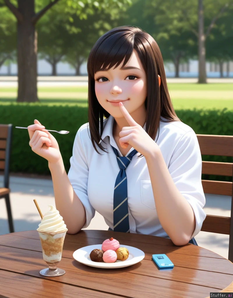 Mei_(overwatch), 25 years old, solo, smug, sitting at a table in a park, surrounded by food, ice-cream, tight_outfit, beautiful_face, photorealistic, detailed, detailed eyes, alone, (detailed face)), button up shirt, tie, pants, ((no tattoo, no helmet, no braids, straight hair))
