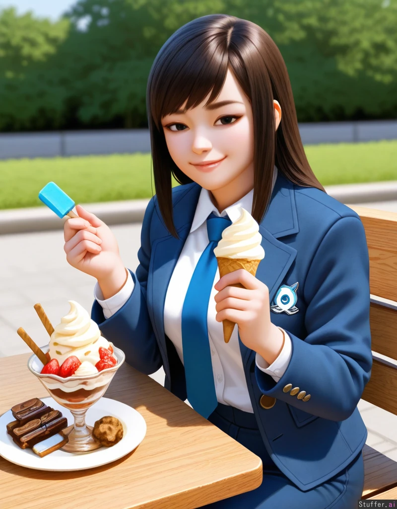 Mei_(overwatch), (Asian features) 25 years old, solo, smug, sitting at a table in a park, surrounded by food, ice-cream, tight_outfit, beautiful_face, photorealistic, detailed, detailed eyes, alone, (detailed face)), button up shirt, tie, pants, blazer, ((no tattoo, no helmet, no braids, straight hair))